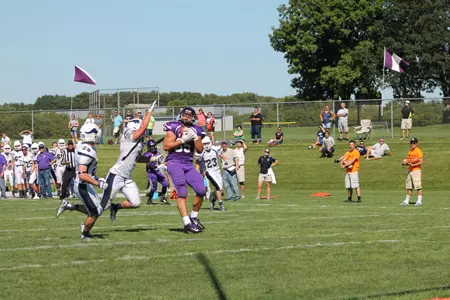 Trine began the game with the ball and quickly drove down the field. On third down Trine's quarterback scrambled towards the end zone but Seth Swinehart (Rockford, Ill./East) chased him down from behind to force a fourth down. The Thunder attempted a field goal which was pushed wide left. That was the closest either team would get to scoring in the first quarter and each team would either punt or turn the ball over on downs the rest of the quarter. The second quarter was a different story.
